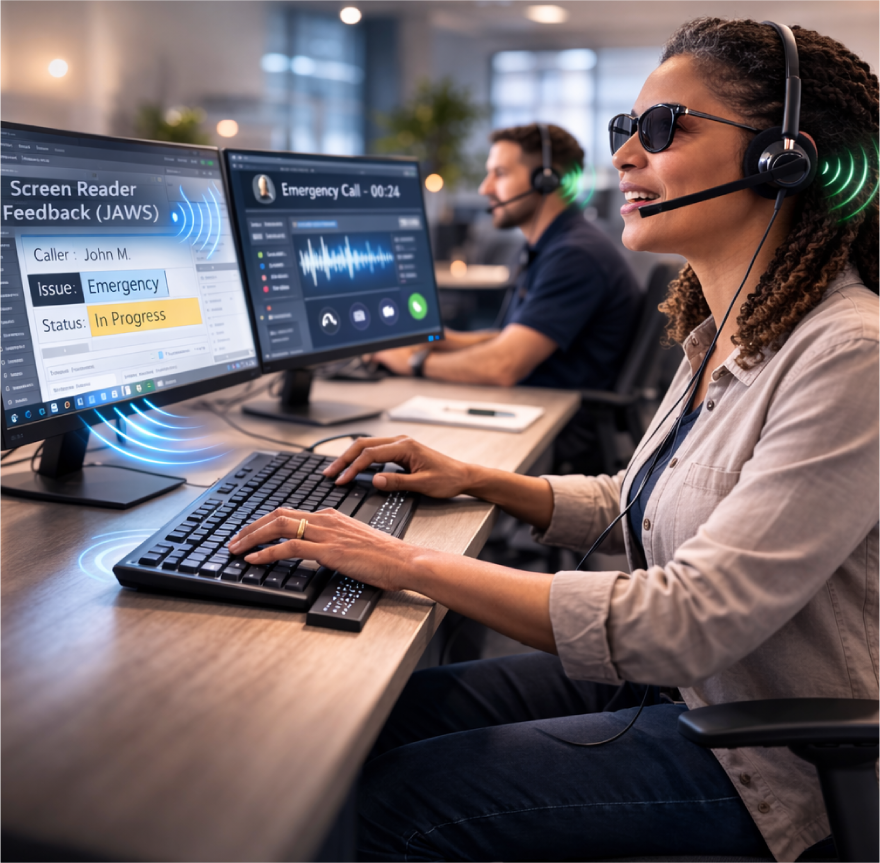 Designed specifically for visually impaired call-centre agents, customers service representatives, or emergency dispatchers. The headset allows you to type, listen to screen-reader feedback and handle phone calls simultaneously, without missing a word from either source.